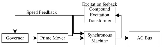 The diesel generator comprises a speed governor, prime mover, compound excitation transformer, and a synchronous generator [49]. The block diagram of a diesel generator set is shown in Figure 4 [50]. The engine’s speed is usually maintained at a fixed speed by using speed governor typically 1500 or 1800 rpm. [51]. The reason for utilizing diesel gen-sets are their relative ease of starting, reliability, compact portability and power density such that their usage is widely spread. In order to control the current and/or voltage, the diesel engine model requires some control mechanisms. The output of the synchronous machine can be controlled by controlling the field current. The excitation system is responsible to provide field voltage Efd for a synchronous machine and is utilized to provide an initial magnetic field to start the synchronous machine as well.