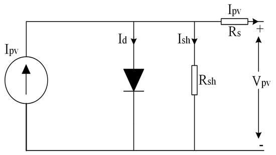 The PV model in the Simulink library is utilized in this paper; the PV source comprises of several strings of PV modules linked in parallel whereas each string contains the number of series PV modules as well. The equivalent circuit of a PV module based on an electrical system is illustrated in Figure 6 [52]. The mathematical model of a PV module can be expressed by the Equations (2)–(7).