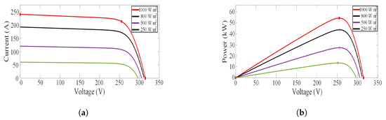 The PV characteristic curve of PV module with specified temperature (25 C) and varying irradiance is shown in Figure 7 where Figure 7a illustrates the I-V characteristic and Figure 7b shows the P-V characteristics of solar array.