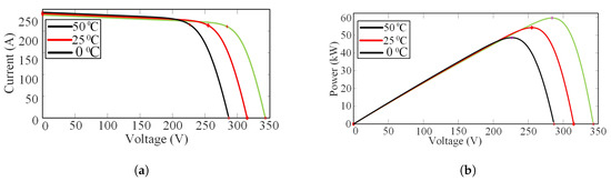 The characteristic curve at varying temperature and specified irradiance (1000 W/m2) is depicted in Figure 8 where Figure 8a illustrates the I-V characteristic and Figure 8b shows the P-V characteristics of solar array.