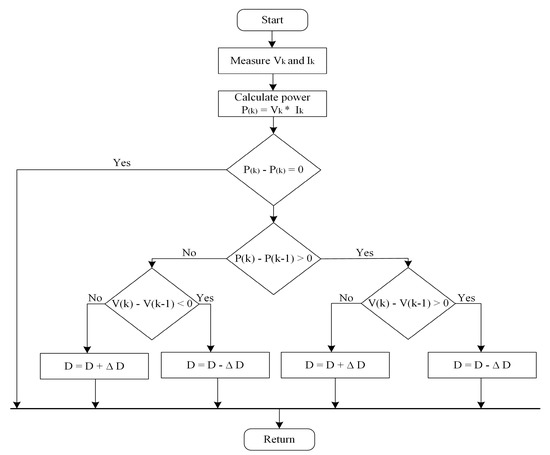 The efficiency of a PV module can be maximized using maximum power pint (MPPT)-based algorithms. In this paper, a Perturb and observe (P & O)-based algorithm is utilized due to the simplicity of the method and its accuracy of tracking. The P & O algorithm tracks the MPPT by increasing or decreasing the voltage repeatedly at the MPPT of the PV system. The inputs to the MPPT algorithm are the output current (Ipv) and voltage (Vpv) of PV module. The flow chart of P & O algorithm is illustrated in Figure 9. In order to implement this methodology, the voltage and current of PV modules must be initially measured [53]. The output of the P & O algorithm is the estimated MPPT voltage (Vmp), which is utilized to control DC–DC converter in order to attain continuously PV source open-circuit voltage.