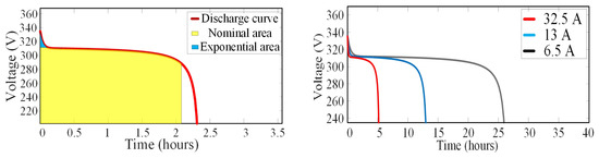 The battery models are categorized mainly as an electric circuit model and electrochemical model, the rest of the models are usually derived from these; for instance: a dynamic battery model that is derived from a combination of an electrochemical and an electrical model. Some researchers further categorized this as an analytical and mathematical model [54]. The former one is based on the empirical data such as Peukert’s equation, which involves integrating current to improve the model of a battery. On the other hand, the latter is a simplified electrochemical model like, for instance, Stepherd’s equation. The reason for utilizing a mathematical model in this paper is the high efficiency and cost-effective tools such as MATLAB/SIMULINK [55].