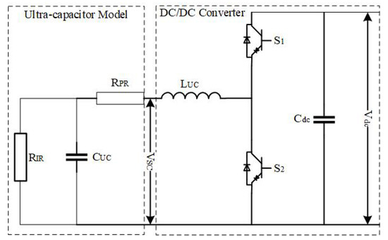 The configuration of the ultra-capacitor utilized in this study is depicted in Figure 11 which comprises an ultra-capacitor model and a DC–DC converter. This model is the combination of equivalent internal resistance (RIR), equivalent parallel resistance (RPR), and capacitance of an ultra-capacitor. The configuration acts as a boost converter in discharging mode whereas the buck converter in the charging mode. As the response time of the ultra-capacitor is very fast and has the capability to smooth the fluctuations produced by the highly intermittent nature of the PV modules, especially when it is integrated with the shipboard microgrids as compared to terrestrial microgrids.