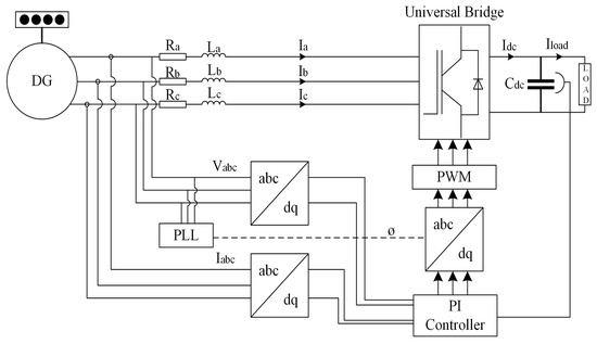 A rectifier is usually a six-pulse-type as it consists of six diodes and is found to be a cost-effective approach to convert Alternating current (AC) power into Direct Current (DC). This approach produces harmonics into the shipboard power system, which results in an additional heat and losses. One of the possible approaches is to use multiple-rectifiers like 12-pulse, 18-pulse, etc. to minimize the harmonics but this approach increases the cost due to an increase in the number of diodes. Another approach is to add passive filters that inject low impedance into the power system to absorb harmonic frequencies, but the disadvantage of this approach is that a passive filter utilizes more energy and takes a large amount of space. An active front end converter is utilized in this study and it is an effective approach that minimizes the total harmonic distortion, flexible regulation of dc-link voltage, provides unity power factor, and relatively sinusoidal input currents [57]. The block diagram of the active front with the control mechanism is illustrated in Figure 12.
