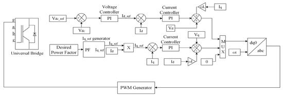 In this technique, instead of utilizing diodes to convert AC into DC, insulated bipolar transistors (IGBTs) are used. The total harmonics in this approach are reduced to 3%, which in the conventional diode rectifier approach are around 25–30%. The schematic of the implemented control strategy of three-phase active front end converter is implemented in MATLAB/Simulink, and is depicted in Figure 13. At first, the dc-link voltage (Vdc) is compared with the reference value (Vdc_ref) and then the error is fed to the outer loop of PI controller. The output of the controller is Id_ref which corresponds to the active power of the converter. The input reactive power of the active front end converter is adjusted by setting the current reference of q-axis (Iq) to 0 to achieve power factor equals to 1.