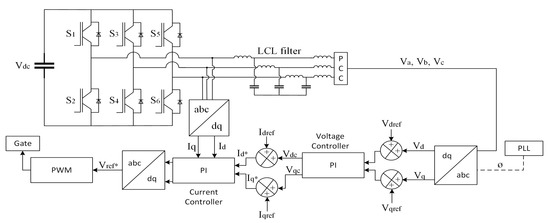 The control strategy applied for an inverter consists of two control loops, the outer loop which is pledged to control dc-link voltage whereas the inner loop is pledged to control grid current as illustrated in Figure 14. The current loops further solves power quality issues such as improved power factors and low THD. On the other hand, the voltage control loop is helpful in balancing the flow of power in the system. D-q control or synchronous reference frame-based control uses a reference frame transformation abc to dq (current park transformation and voltage park transformation), which transforms the voltage and current into a d-q frame. The transformed current is helpful in controlling the grid current whereas voltage detects frequency and phase of the grid. Therefore, the control variables are converted to dc values, hence, controlling and filtering become easier. (Vd_ref) and (Vq_ref) are the voltages in dq frame whereas to generate the gate signal for voltage source inverter, pulse width modulation (PWM) is utilized.
