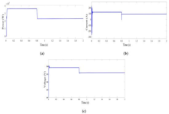 In the first case, as discussed before, the PV systems show more fluctuations in scenarios of integration with a shipboard microgrid due to the movement of ships and other factors such as moisture, weather, etc. The Li-ion battery and ultra-capacitor are hybridized and are integrated with the output of PV modules using dc-dc converter in parallel to the dc-link capacitor. In this study, at the start irradiation is set to be maximum and is varied at 0.8 s to check the effectiveness of the proposed approach. Figure 17a illustrates the variation in power, Figure 17b refers to the current, and Figure 17c shows the voltage with the variation in irradiance.