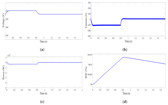 Simulation results of Li-ion battery (a) Voltage of Li-ion Battery, (b) Current of Li-ion Battery (c) Power of Li-ion Battery (d) State of charge (SOC) of Li-ion Battery.