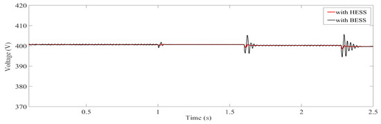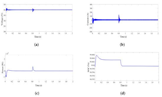 The ultra-capacitor is hybridized with the battery to cater for the higher frequency fluctuations. It can be inferred from Figure 19a–c, that at 0.8 s there is sudden decrease in voltage, current, and power that illustrates the variation in irradiance. In the start, SOC of the ultra-capacitor is constant as its fully charged. At 0.8 s due to sudden variation in irradiance, fluctuation is observed. The ultra-capacitor is responsible to cater for the high-frequency fluctuation. It can be seen from Figure 19d that SOC of the ultra-capacitor suddenly decreases and remain constant for the rest of the period as the battery is responsible to cater for rest of the duration.