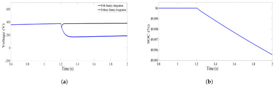 A Li-ion-based battery is utilized in this study to cater for the low-frequency fluctuations. It can be inferred from Figure 18a–c, that at 0.8 s, there is a decrease in voltage, current, and power that show the variation in irradiance. Hence, the battery is providing the power to maintain the voltage at DC-link. It can be further observed from Figure 18d that the battery is getting charged at the start as the irradiance of the solar panel at that instant is considered to be maximum. At 0.8 s, due to variation in irradiance, the battery starts to support due to which the battery drains and ultimately the SOC of the battery decreases.