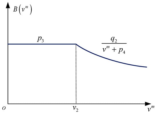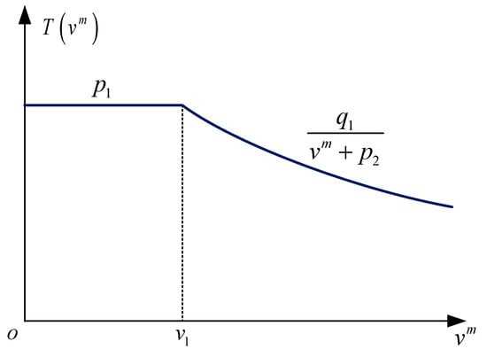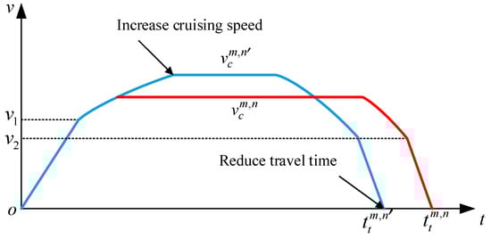 Numerical examples are based on the data of the Shanghai Metro Line 1, a network with narrow spacing between adjacent stations []. Hence, trains travel in each section in a sequence of accelerating-cruising-braking, without repeated accelerating and braking. The cruising speed has a one-to-one mapping from the travel time in interstation . As shown in Figure 4, the area enclosed by the red curve and axis indicates the section spacing. If the cruising speed increases to , the travel time will decrease to to keep the section spacing constant, as the blue curve shows.