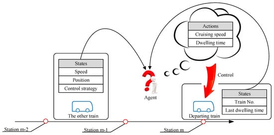 where is a parameter. Figure 5 shows the sketch map of the DDPG in a two-train network, where the agent is observing the state of trains in the metro network from the environment and thinking which action should be taken for the departing train. The action works on the environment, then the trains get into the next state. During each step, the environment provides a reward to the agent.