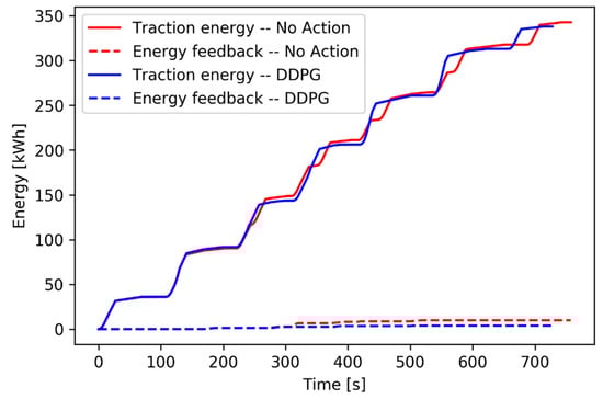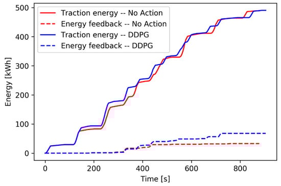 In Figure 8, the reward curve presents an uptrend with the episode increasing, but it is not beyond zero in the final episode. According to the reward function, the reason is obvious that the relative traction energy and the relative feedback energy are cancelled out. In another word, the final reward is not beyond zero, because DDPG saves the traction energy, while wastes the feedback energy. Figure 9 shows the energy accumulation for one episode under an 11 s delay.