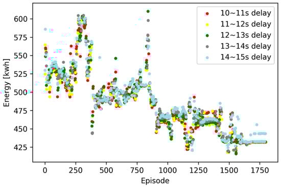 Here, Memory_capacity represents the size of the buffer , Batch_size represents the size of the minibatch , represents the update rates from the current network to the target network, represents the discount factor, and is the reward parameter. Figure 7 shows the total energy consumption for each episode, more specifically, the training episodes of DDPG under discretely sampling random disturbances.