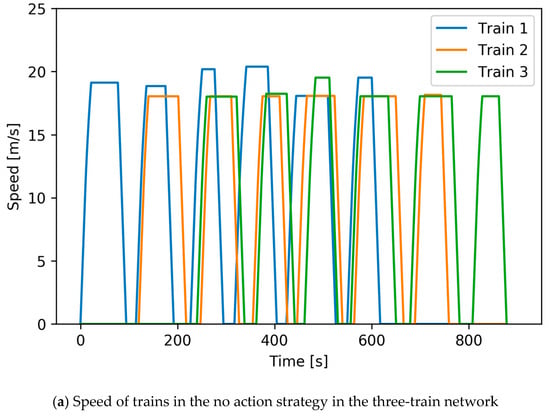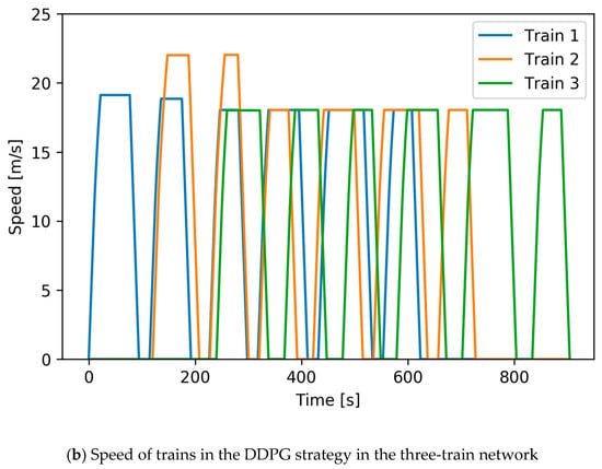 Figure 15 shows the speed curves under a 13.60 s delay in the three-train network, in which Figure 15a shows the speed of trains in the no action strategy and Figure 15b shows the speed of trains in the DDPG strategy. DDPG raises the cruising speed of train No.2 in the first two interstation, and adjusts the dwelling time to synchronize acceleration and braking, which maximizes the feedback energy. DDPG also reduces the cruising speed in other interstations of train No.2 and the cruising speed of other trains to reduce the traction energy.