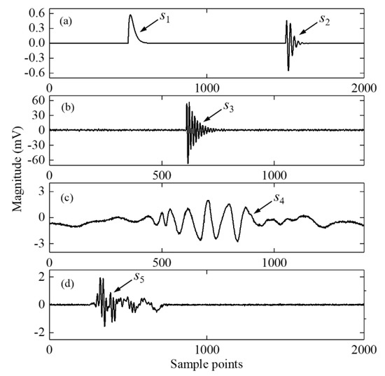 The field-detected PD signals s4 and s5 are shown in Figure 1c,d. s4 was measured on a 10 kV XLPE cable system with a sampling rate of 500 MS/s, and s5 was measured on a HV cable system with a sampling rate of 100 MS/s.