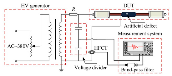 The laboratory-measured PD signal was captured from an artificial incision defect on the insulation layer of a 35 kV XLPE cable joint. Specifically, the incision defect was made by cutting into the insulation layer along the longitudinal direction with a sharp knife. The starting point of the incision defect was at the cutoff point of the outer semiconducting layer in the cable joint. The length, width, and depth of the insulation incision defect were 100, 0.2, and 1 mm, respectively. The schematic of the experimental setup is shown in Figure 2. The voltage applied on the cable was raised gradually to 26 kV until the partial discharge is stable. Then, we recorded the PD signal. PD signals were transferred by a high-frequency current transformer (HFCT), with bandwidth and maximum sensitivity at 2.5–216 MHz and 5.83 V/A, respectively. To filter out low-frequency interference, a bandpass filter was connected between the HFCT and the digital oscilloscope. The bandwidth of the bandpass filter was 1.2–80 MHz, and the bandwidth of the sampling oscilloscope was up to 1 GHz. Moreover, the maximum sampling rate of the oscilloscope was 5 GS/s. Figure 1b shows the real PD signal s3 generated in the insulation incision defect. The sampling rate of s3 was 50 MS/s.