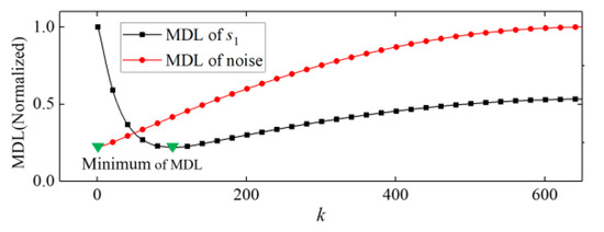 where X is a set of observations, X = {x(1), x(2), …, x(N)}; Θ is the parameter vector of models; f(X|Θ) is a family of models (a family of probability density of Θ); is the maximum likelihood estimate of the parameter vector Θ; k is an index which can determine the number of parameters in Θ (0 ≤ k < m). In Equation (3), the first term is the log-likelihood of the maximum likelihood estimator of the parameters of the model. The second term is a bias correction term for making MDL an unbiased estimate of the mean Kulback–Liebler distance between the model density f(X|Θ) and the estimated density f(X|).
