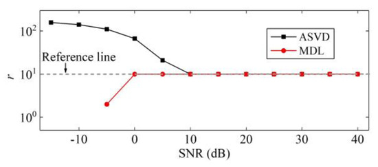 Moreover, in order to show the effect of using MDL in singular value selection, we set another experiment as follows. We generated five sinusoidal signals with different frequency (1, 3.3, 5, 8.1, and 10 MHz, respectively) and the same amplitudes and phases (10 mV and 0°). Then, we mixed the sinusoidal signals together to obtain a mixed signal which contained five signal components with different frequency. ASVD [26] and MDL were used to identify r of the mixed signal, which ought to be 10. The results of singular value selection under different SNR is shown in Figure 4. The reference line consists of the correct value of r under different SNR. From Figure 4, Both ASVD and MDL performed well under high SNR. However, MDL kept relatively better performance under low SNR while ASVD overestimated the number of effective singular values. When SNR was extremely low, MDL determined r as zero.