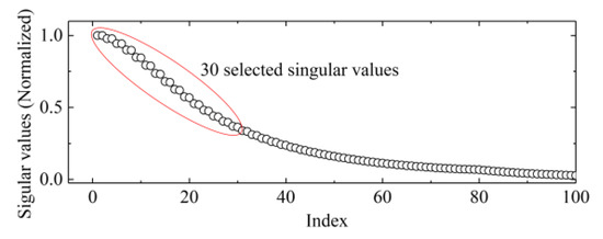 where N is the total number of signal points; σi is the singular values of the signal. Determining the number of effective singular values in this paper shares the same principle with detecting the number of signals by Wax. The number of effective singular values r is determined as the value of k ∈ {0, 1, …, m − 1}, which makes MDL minimized.
