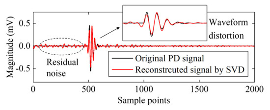 Because of the complexity of a PD signal, even though a proper value of r is determined, features of the original PD signal still cannot be perfectly preserved. As a result, the denoised results usually exhibit waveform distortion and contain some residual noise.