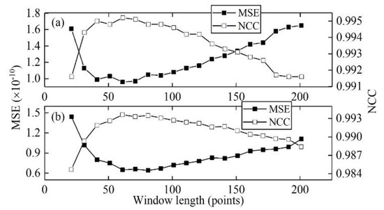 The only parameter that needs to be preselected in the ASTSVD method is the sliding window length. To compare the denoising effect of ASTSVD with different sliding window lengths, two parameters, including the mean square error (MSE) [40,41] and normalized correlation coefficient (NCC) [42,43] were used to evaluate the performance of the ASTSVD. MSE and NCC are defined as