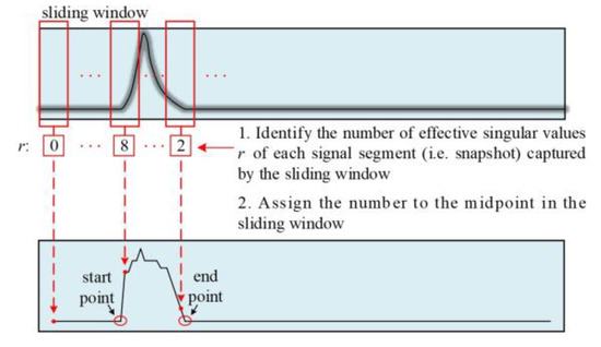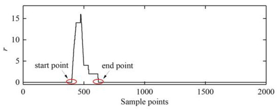 According to the principle above, we need to know the width of a PD pulse to determine the sliding window length. First, if we are aware of the sampling rate and general width of a PD pulse in cables (around 1 μs), we can estimate the number of sample points within the PD pulse through dividing the width of the PD pulse by the sampling rate. Then, the sliding window length can be estimated roughly according to the above-mentioned principle. Besides, time domain energy of a signal [44] and instantaneous curvature of a signal’s waveform [45] can also be used to identify boundaries of a PD pulse. In addition, ASTSVD can also locate the start points and the end points of a PD pulse by identifying the number of effective singular values r. The procedure is as follows: we move a sliding window point by point along the time axis of the PD signal. Then, we select the number of effective singular values r of each signal segment (i.e., snapshot) captured by the sliding window. Each value of r is assigned to the midpoint of the sliding window. Finally, we can obtain a singular value distribution spectrum which shows the boundaries of the PD pulse clearly. The procedure for identifying the boundary of a PD pulse by ASTSVD is shown in Figure 8. A singular value distribution spectrum is shown in Figure 9. As we know the boundaries of a PD pulse, we know its pulse width. Then, we can determine sliding window length according to the above-mentioned principle.