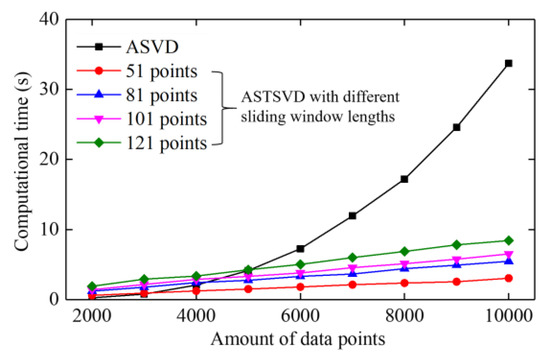 When processing PD signals with a large amount of data, ASVD [26] requires a great deal of memory and much computational time, limiting its applicability. However, by applying a sliding window, ASTSVD can reduce both the memory requirements and the computational requirements. To compare the computational time of ASVD and ASTSVD, simulated PD signals s1 of different sizes embedded in AWGN with SNR = 0 dB were denoised using ASVD and ASTSVD. The data amount of the PD signals ranged from 2000 to 10,000 sample points. Figure 12 shows that the computational time of ASVD and ASTSVD varies with the size of PD signals. ASTSVD consumes much less computation time than ASVD when processing large amounts of data. Even when the sliding window lengths increase, the computational time of ASTSVD is still much less than that of ASVD.