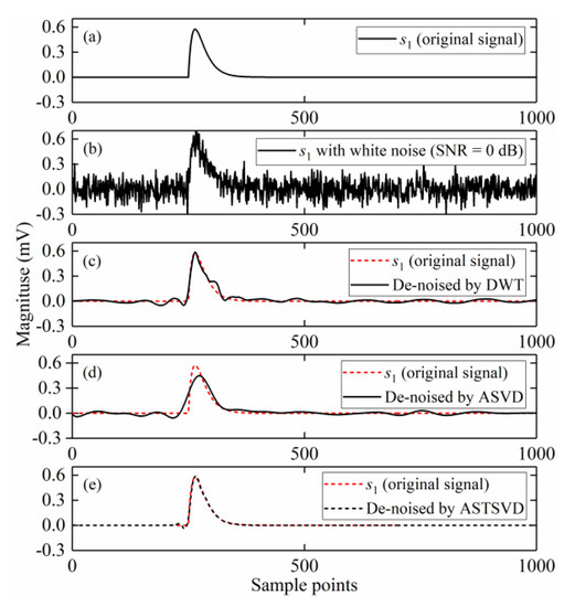 When some denoising methods are applied to a PD signals with high SNR, waveform distortion of the PD pulse may occur in the denoised results. To show the performance of ASTSVD under high SNR, simulated PD signal s1 embedded in AWGN with SNR = 30 dB was filtered by ASTSVD and ASVD.