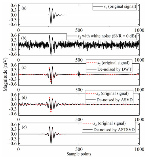As shown in Figure 13 and Figure 14, compared with the results of the DWT-based method and ASVD, the ASTSVD denoising results are more approximate to the original PD signals. Because s2 is oscillated, some oscillation occurred in the ASVD result, as depicted in Figure 14d. Table 1 demonstrates the MSE, NCC, and SNR of the two PD signals which were denoised by using different denoising methods (related calculations were repeated 100 times, and the results were averaged). As shown, ASTSVD is much better than the other two methods.