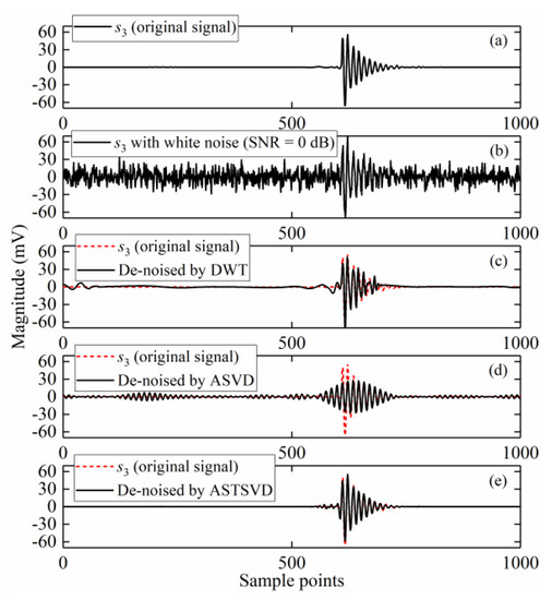 To verify the effect of ASTSVD on practical PD signals, the laboratory-measured PD signals was denoised. Then, wavelet shrinkage with db8 wavelet and soft thresholding was applied to it to obtain the original PD signal of s3 [4]. Figure 15 shows the original PD signal of s3 and its corresponding noisy PD signal embedded in AWGN with SNR = 0 dB, together with denoised results from the three denoising methods (the DWT-based method, ASVD, and ASTSVD). db8 wavelet, 6 levels of decomposition, and hard thresholding were used in the DWT-based method. The length of the sliding window Tw was 101 points in ASTSVD according to the principle mentioned in Section 3.3.