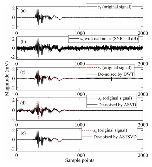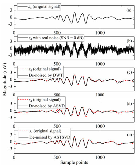 The denoised results of s4 and s5 are shown in Figure 16 and Figure 17, respectively. Table 3 shows the evaluation results based on MSE, NCC, and SNR. Although, the denoised results of s4 by using the DWT-based method and ASTSVD seem close in Figure 16, the MSE, NCC, and SNR results of ASTSVD are still better than the results of the DWT-based method.