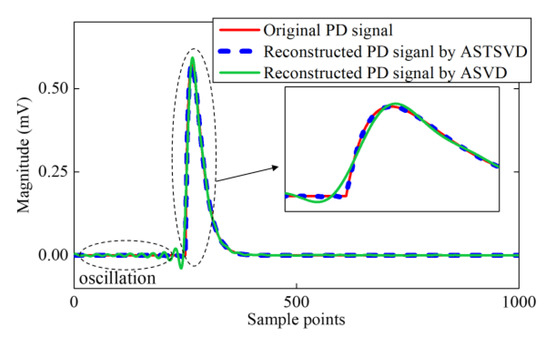 Figure 18 shows the denoised PD signals by ASTSVD and ASVD. The denoised results indicate that ASVD may cause waveform distortion and generated some oscillations, even though a proper value of r was selected automatically (21 singular values were selected by ASVD in this experiment). However, the ASTSVD with a sliding window (Tw = 101) reconstructed the original PD signal without waveform distortion even under high SNR.