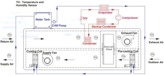The hybrid SDCS configuration was the first configuration investigated. In this configuration, the only heat source for the regeneration process is the condenser of the integrated heat pump, as shown in Figure 1. In this configuration, chilled water is generated by the evaporator and stored in a chilled water tank. The chilled water is pumped to pre-cooling and cooling coils in order to cool process air from the environment. In the integrated heat pump sub-system, an additional condenser installed outside the air handling unit can eject excessive condensation heat to the surroundings and avoid the over-loading of the compressor due to higher condensation temperature in the refrigeration cycle. The return air stream gains heat from the condenser inside the air handling unit, then heats the upper part of the solid desiccant wheel and causes the vapor pressure in the solid desiccant to be higher than the vapor pressure in the air stream. The moisture in the solid desiccant is ejected to the surroundings with the air stream. The moisture removal from the desiccant wheel by additional heat in the return air stream is called the regeneration process.