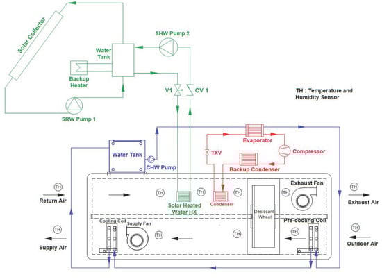 In the solar-assisted hybrid SDCS configuration, the condensing heat of the integrated heat pump and the heat of solar-heated water are used as heat sources for the regeneration process. In the regeneration air stream, the returning air is pre-heated by solar-heated water from a heat exchanger. Then, the returning air passes the condenser of the integrated heat pump to recover the dissipating heat from the condenser again in order to increase the regeneration temperature. In terms of process air, the air handling process concept is the same as in the hybrid SDCS configuration. The corresponding system configuration is shown in Figure 3.