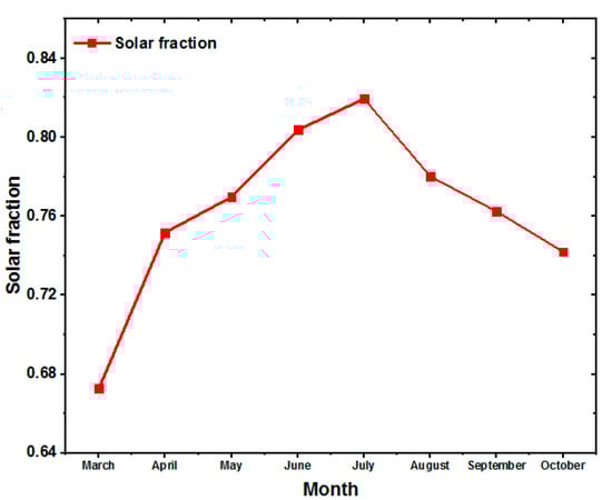 Solar fraction (SF) is an important technical indicator to assess the feasibility of solar cooling systems. The higher the value of SF, the greater the contribution of solar energy to the system. SF is the ratio of the solar energy contribution to the total energy input needed to drive the solar cooling system. The total useful solar energy was described in the previous section and the total energy input of the system is the total energy input for the system’s operation per month. The average SF value of the solar-assisted hybrid SDCS for each month is provided in Figure 5. As shown in Figure 5, it can be observed that the solar collector system shows a high contribution in July. This is because it is the peak summer season at this time, so the energy gained from the solar system is higher. On the other hand, the total energy required to operate the system is approximately constant in each month. The SF of the system in July is 0.82 and the lowest SF occurs in March with the value of 0.673.