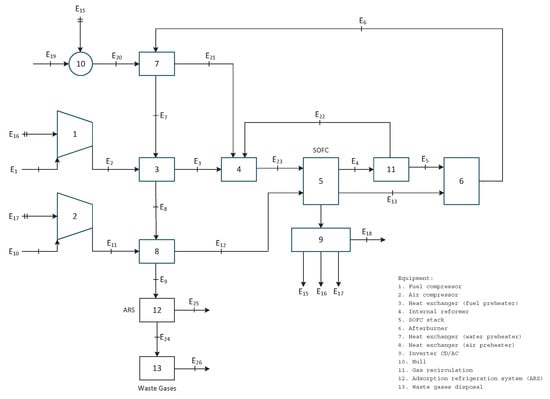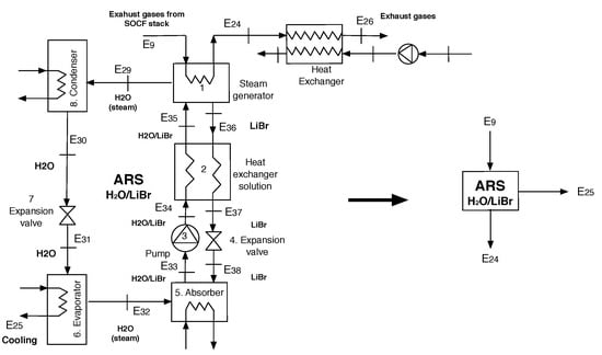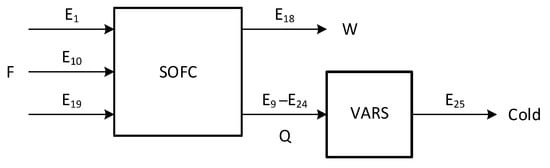 Consider the integrated system SOFC-VARS system depicted in Figure 5, where each plant is considered to be a simple process. If the exhaust gases yielded in the SOFC stack are not reused in other systems, it means that all its exergy is wasted and therefore its cost is charged to the electricity.