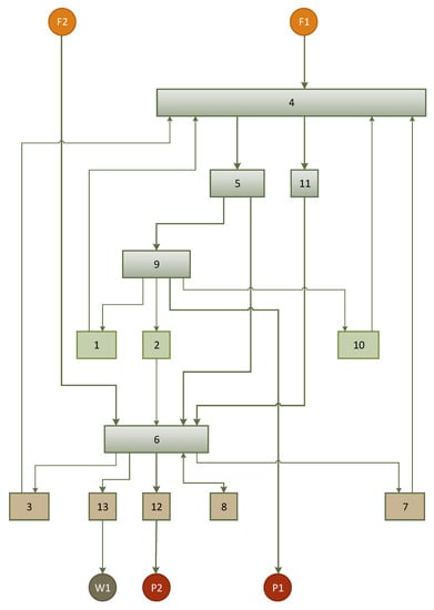 The recent work of Torres et al. [] describes an algorithm to build the productive structure diagram by means of the fuel-product table. The fuel-product table is the adjacency matrix of the productive graphs and it shows how the processes of a system interrelate among themselves and the environment, through the fuel-product definitions. For this particular case, the productive structure proposed for the SOFC-VAR system is shown in Figure 3.