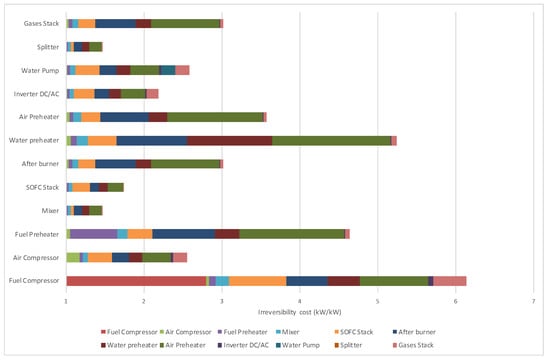 Among the benefits of the theory of exergetic cost is the fact that it allows a clear understanding of the cost formation process through the system. This can be better understood by means of Figure 4, which shows the contribution of the irreversibility generated in the i-th process to the unit cost of th product of the j-th equipment. For example, the unit product cost of the SOFC (1.74 kW/kW) is mostly comprised of the irreversibility contribution from the SOFC itself (13%), the air preheater (11%), the water preheater (7%) and the afterburner (6%), whereas the environment account for as much as 57%. Most importantly, it can be noted that the product of the fuel compressor is the most expensive, in terms of exergy consumption, because most of its contribution is due to its own inefficiency.
