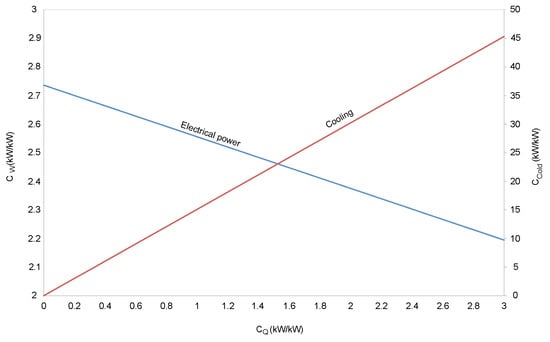 Variation of the unit exergy cost of electricity and refrigeration as a function of by-product exhausted gas costs.
