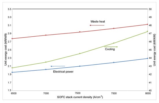 An important control parameter when it comes to operating SOFC stacks is the current density. It is interesting to study its influence on the unit exergy costs of both electricity and exhaust gases, as is shown in Figure 7. It can be noted that a variation in the current density impacts both variables equally. Yet, the unit exergy costs of the exhaust gases are 45% higher than those of the electricity. This stems from the fact that exhaust gases have gone through a series of heat exchangers before leaving the SOFC system and, as a consequence, have assimilated the irreversibilities of each piece of equipment in accordance with the principle of the cost formation process of residues []. In general, the unit exergy cost of both variables increases as current density rises too. It must be kept in mind that the stack voltage decreases because of the increased current density, which explains the reason the unit exergy cost also increases.