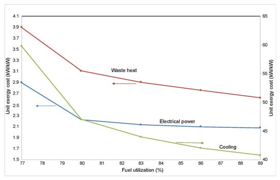 - The study of the effect of the fuel use on the unit exergy costs has shown that below 80%, the unit exergy cost of the cooling is the most sensitive of all. However, above 80%, the unit exergy cost of the electrical power has remained constant, 2.1 kW/kW.