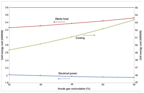 The analysis of anode gas recirculation is of particular interest, as apart from providing the heat for the steam-reforming reaction, it is used to control the stack difference temperature and hence the air for the cooling rate. Thus, in terms of costs, Figure 9 unveils the unit exergy cost of electricity and exhaust gases as a function of the anode gas recirculation. Interestingly, two trends in the costs can be observed as the percentage of gas recirculation rises. On the one hand, the unit exergy cost of electricity slightly decreases, which is largely due to the higher fuel use as a result of the anode gas recirculation increase and hence the improvement in the stack efficiency as investigated in the work of Peters et al. []. On the other hand, the unit exergy cost of the exhaust gases increases because they have lower energy availability as a result of bifurcation or by-pass and hence its unit cost increases. However, an increase in 25% in the anode gas recirculation does not have a notable effect on the unit exergy costs, this is lower than 1%.