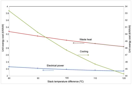 - The analysis of the impact of the stack temperature difference on the unit exergy costs has been of further interest. The results have revealed a steeper fall of the unit exergy cost of cooling as the temperature difference begins to increase. In thermodynamic terms, this situation would be ideal but due to operational and safety reasons, the stack temperature difference cannot reach higher values.