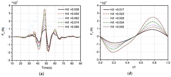It should be pointed out that the inline forces along the wave propagation direction are the most important forces in the study of wave-structure interaction as compared to the forces along y and z directions [16,34]. This can be seen in Figure 10, where the force components in x, y, and z directions are displayed for a regular wave case (H = 8.0 m, T = 15.0 s). As can be seen from Figure 10, Fx is much larger than Fy and Fz, its impact on the structure is large. Therefore, only the inline forces are deeply investigated in detail in the following sections.