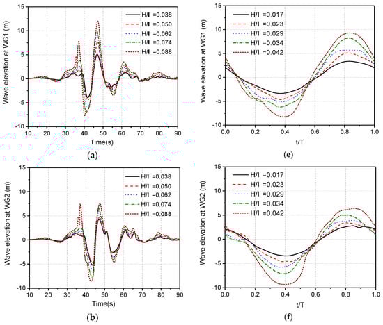 Apart from the load analysis, the wave run-up is another crucial parameter that is widely adopted in the design of offshore structures or to investigate the occurring of wave over-topping especially under severe sea states. It is well accepted that the rapid rise of wave surface can cause large wave impacts on offshore structures [35,36]. Therefore, in this section, the predicted wave run-up from CFD analysis will be also discussed.