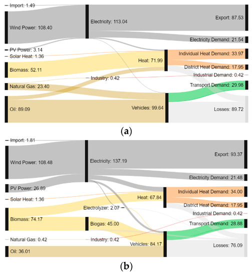 Sankey diagrams of energy flows in GWh for Samsø for 2015 (a) and 2030 (b) [32].