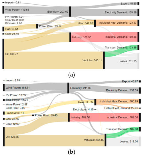 Sankey diagrams of energy flows in GWh for Orkney for 2014 (a) and 2030 (b) [32].