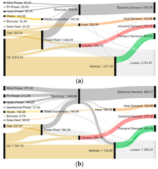 Next to the RE for electricity production, solar radiation is further used for heat production. Other heating fuels are electricity, biomass, gas, and a minor share of oils—50% of the oil is otherwise needed in the transport sector [67]. In total, the reference model shows that 11% of the PES is based on RE, including waste incineration. The electricity production, however, is made up by 29% RE, despite limits in the RE exploitation.