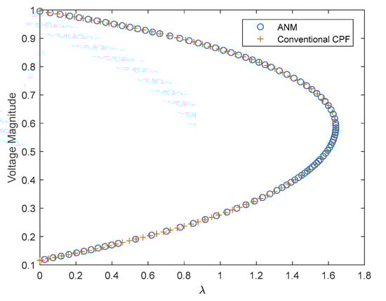 In order to verify the correctness of the ANM, we set the limit of the system reactive power constraint to infinity. This ensures the PV buses or slack bus do not violate the limit in CPF, so the reactive power constraints do not work, as shown in Figure 1. When the scalar embedding parameter increases to , the system load power increases to 2.641 times the initial value. The voltage stability limit will be reached, causing the system voltage to collapse.